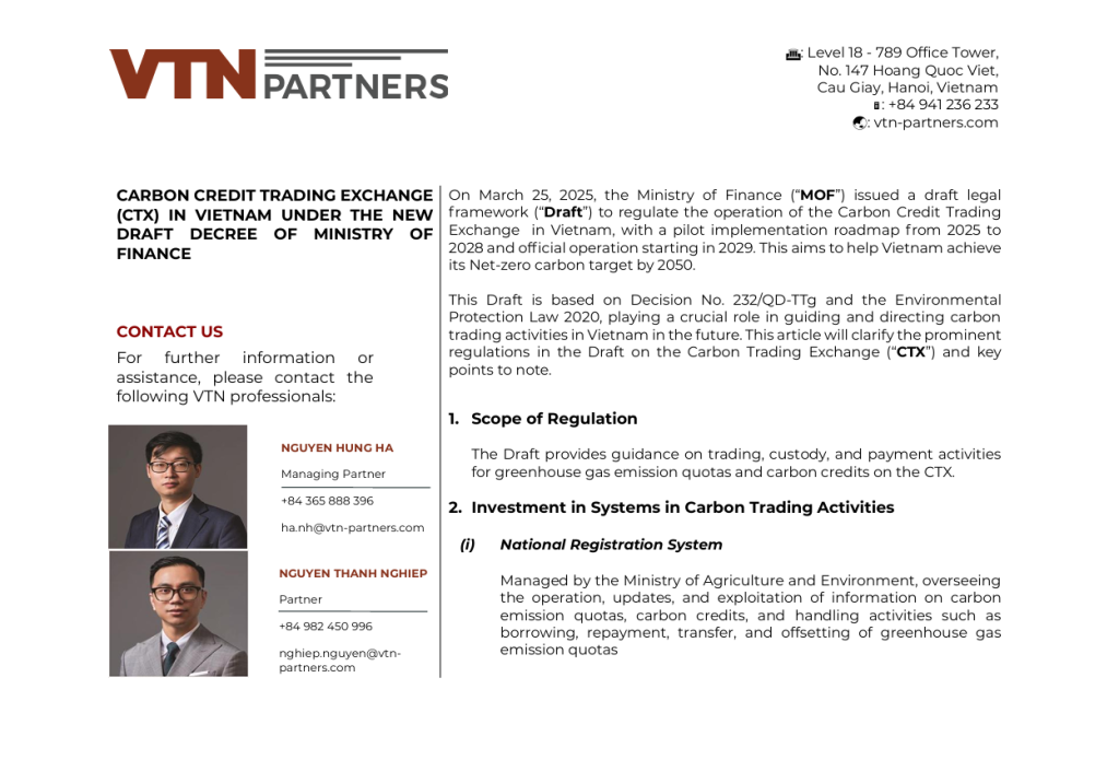On March 25, 2025, the Ministry of Finance (“MOF”) proposed a draft legal framework to regulate the operation of the Carbon Credit Trading Exchange in Vietnam, with a pilot implementation roadmap from 2025 to 2028 and official operation starting in 2029. This aims to help Vietnam achieve its Net-zero carbon target by 2050.